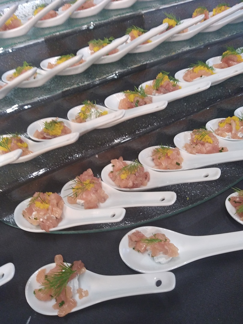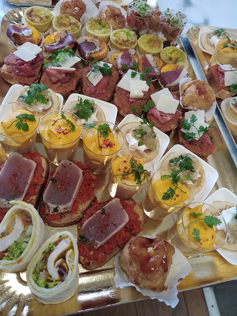 wraps (crevettes, carpaccio de veau, version végé), pintxos (houmous d’artichaut à la truffe blanche, rillettes d’esturgeon au piment d’Espelette + œuf de caille, mousse de lapin…), navettes (saumon fumé & guacamole, tomatade & concombre, rillettes de poulet au curry), tartelettes de crabe, mini muffins ou encore mini quiches.